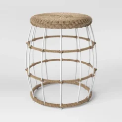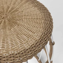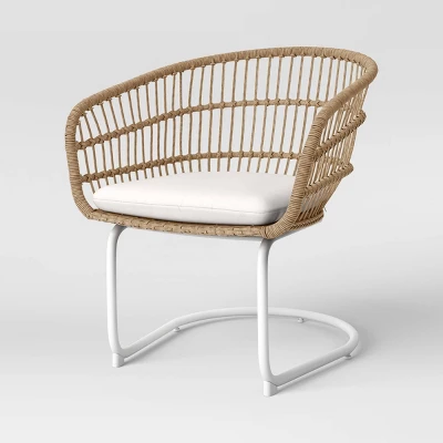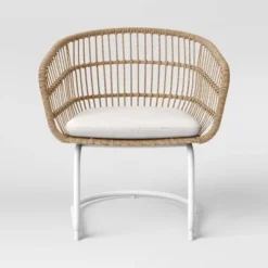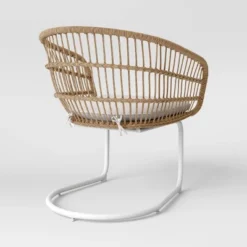 - White steel frame and beige wicker details make for a chic and bold aesthetic