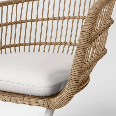 Chat over coffee with a friend with the Southport 3-Piece Motion Chat Set from Opalhouseā¢. This lovely patio furniture set comes with two armchairs with seat cushions and one accent table. The set perfectly accommodates two people and is great for entertaining guests or spending time with family. The pieces feature a white steel frame with beige wicker details that make for a chic and bold aesthetic. These classic colors match easily with any design themes you prefer. Pair with bright and bold colors for a playful space or with neutral colors for a space that is sleek, modern and calming. The rust-, water- and weather-resistant properties mean you can enjoy your outdoor space without worrying about maintenance.